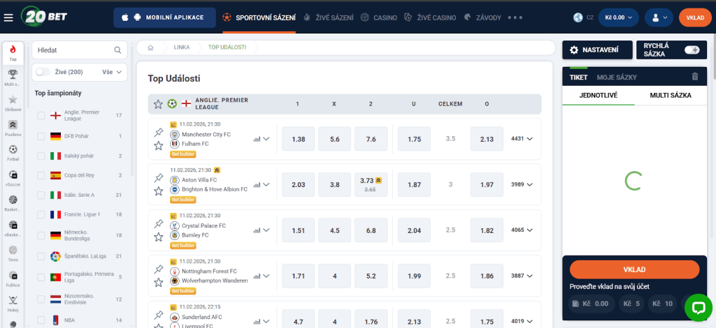 Sportovní sázení je plnohodnotná sekce na platformách jako 20Bet, Spybet nebo FatPirate. Fotbal, tenis, basketbal, lední hokej, MMA i e-sporty — vše s live betting možností a průběžně aktualizovanými kurzy. Bet Builder umožňuje sestavit vlastní kombinaci sázek na jeden zápas. Cashout funkce dovoluje vybrat výhru ještě před koncem utkání — praktická volba při nepředvídatelném průběhu hry.