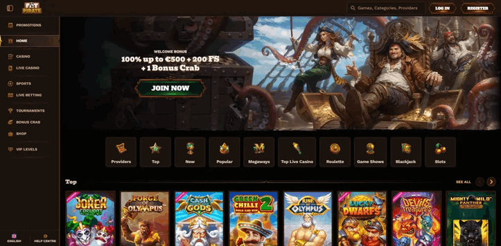 FatPirate má několik funkcí, které na podobných platformách jen tak nenajdete. Spin Rally a Wheel of Fortune jsou nové herní sekce přidávající do lobby pravidelnou interaktivní vrstvu — nejde jen o točení slotů, ale o průběžné výzvy a odměny. Sekce Challenges funguje jako herní mise: splníte podmínku, dostanete odměnu. Shop umožňuje vyměňovat nasbírané coiny za konkrétní benefity. Tournaments sekce je aktivní a nabízí pravidelnou soutěžní příležitost. Rozhraní je přehledné, pirate tematika je zpracovaná konzistentně bez vizuálního přetížení. Sportovní sekce pokrývá pre-match i live sázení. Registrace bez předkládání dokladů proběhla bez komplikací.
